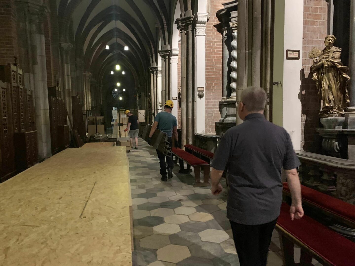 Na parterze katedry wydzielono przestrzeń dla dźwiga oraz pracowników. Ks. Cembrowicz wyjaśnia jednak, że sakramenty oraz liturgie odbywają się w świątyni bez zmian.