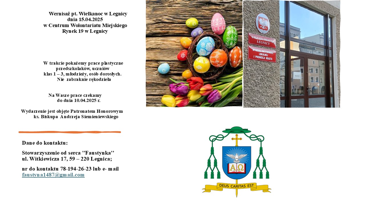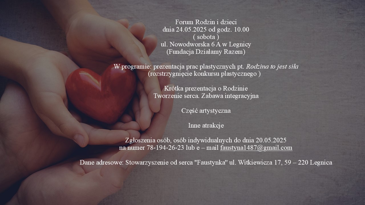 Dzień później, 27 kwietnia od godz. 12.00 do 17.00 Stowarzyszenie od serca „Faustynka” zaprezentuje stoisko na legnickim Rynku w ramach otwarcia Sezonu Turystycznego Dolnego Śląska 2025. Na najmłodszych czeka moc atrakcji. Warto też zaprosić słuchaczy 24 maja od godz. 10.00 na Forum Rodzin i dzieci przy ul. Nowodworskiej 6 A, które będzie połączone z prezentacją prac plastycznych pt. „Rodzina to jest siła”.