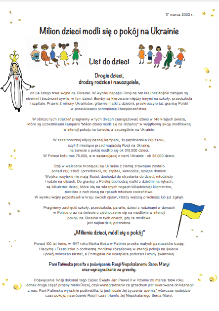 Z polskiej sekcji PKWP wyszła inicjatywa, by wobec wojny na Ukrainie dzieci ponownie szturmowały niebo, prosząc o pokój. Edycja specjalna kampanii „Milion dzieci modli się na różańcu” potrwa przez cały Wielki Post. Zaproszone do udziału są dzieci w każdym wieku, a także dyrektorzy szkół, nauczyciele katecheci i rodzice.