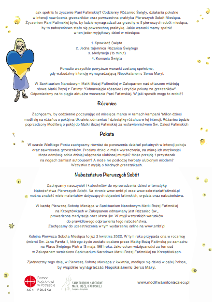 „Chcemy wyprosić pokój na Ukrainie, wyprosić nawrócenie Rosji i rozpowszechnić nabożeństwa pierwszych sobót miesiąca, szczególnie wśród dzieci” – mówi Malwina Wyszyńska, która swoim pomysłem postanowiła zarazić wszystkie krajowe biura Papieskiego Stowarzyszenia Pomoc Kościołowi w Potrzebie na całym świecie. Kampania odpowiada na wezwanie Pani Fatimskiej z 1917 roku i rozpoczyna się już teraz; w tygodniu, w którym Ojciec Święty Franciszek poświęci Rosję i Ukrainę Niepokalanemu Sercu Maryi.