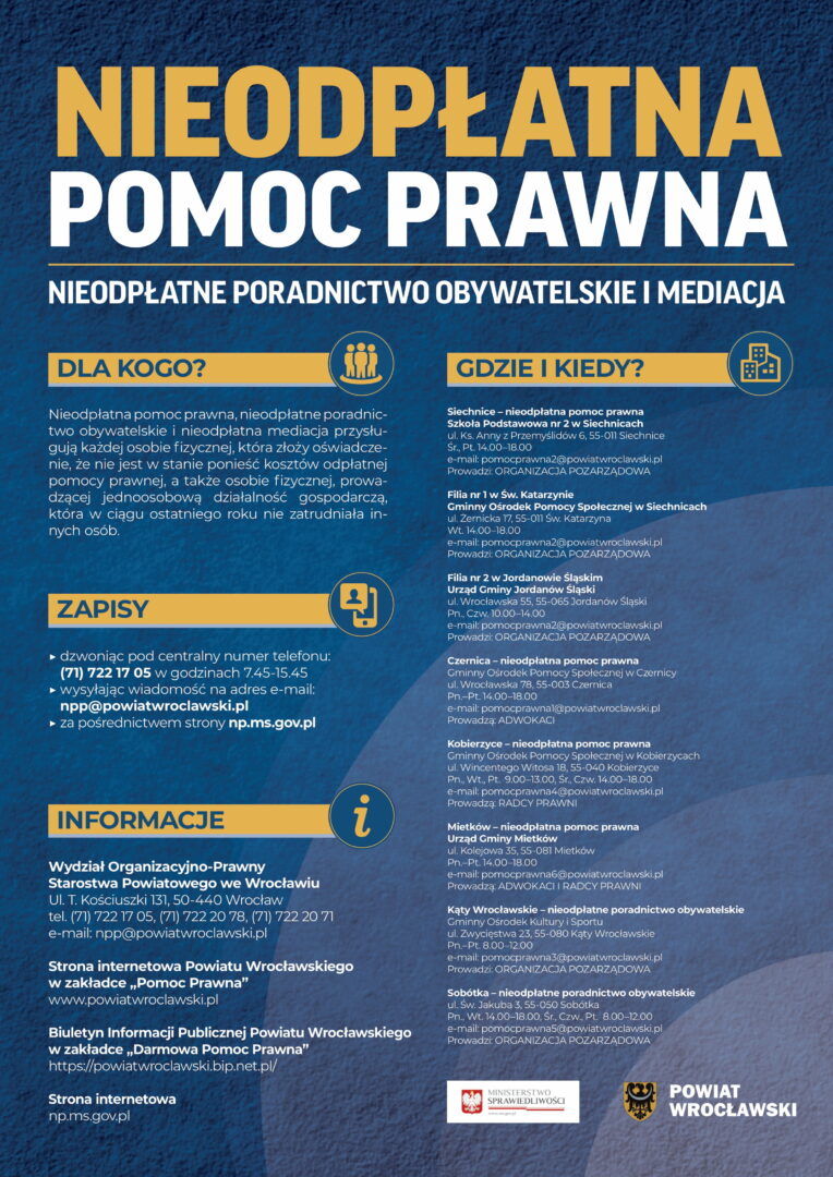 Poniżej przedstawiamy ulotkę informacyjną oraz plakat, które zawierają wszystkie aktualne informacje o funkcjonowaniu punktów pomocy prawnej i obywatelskiej na terenie powiatu wrocławskiego.