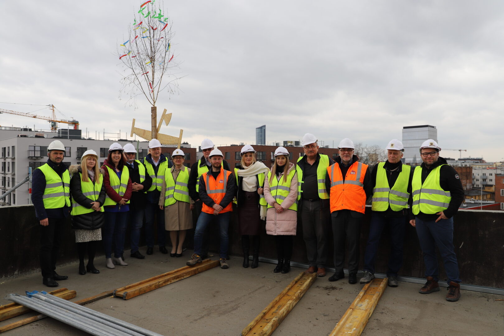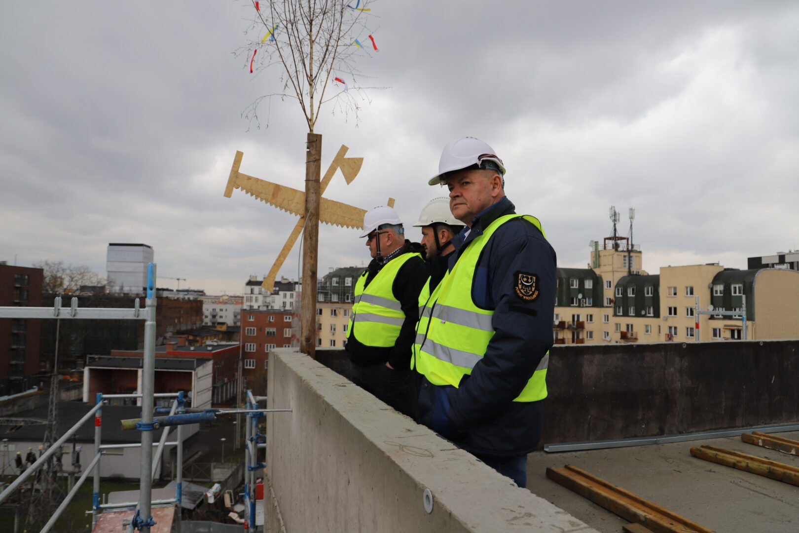 Rozbudowa siedziby Starostwa Powiatowego we Wrocławiu wchodzi w końcową fazę inwestycji. Właśnie zakończono roboty konstrukcyjne budynku. Zgodnie z wielowiekową tradycją, Wykonawca zawiesił na najwyższym miejscu rozbudowywanego urzędu tzw. wiechę, sygnalizując w ten sposób zakończenie robót konstrukcyjnych. Ponieważ mamy do czynienia z rozbudową nowoczesnego obiektu, wiecha nie została zamontowana na krokwi, ale na betonowym murze attyki dachu. Inwestor – Powiat Wrocławski – zamknął tym samym ważny etap stanu surowego budynku i przystępuje do dalszych działań – robót instalacyjnych i wykończeniowych.