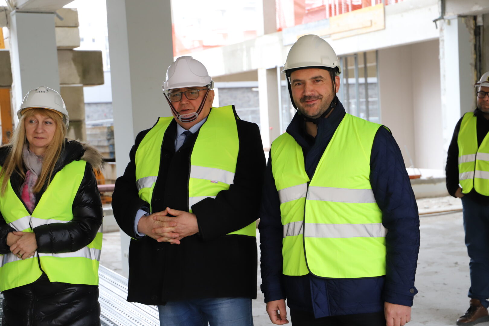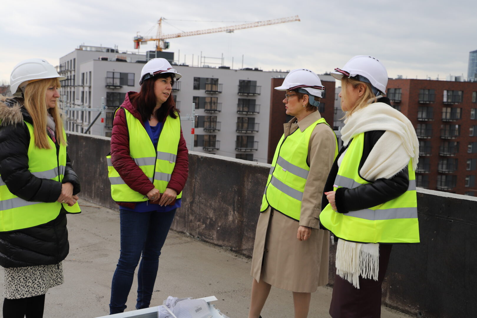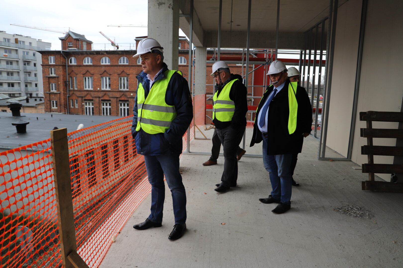 Zarząd Powiatu Wrocławskiego na czele z Panem Starostą – Romanem Potockim, wspólnie z przedstawicielami Wykonawcy robót oraz członkami Zespołu ds. modernizacji budynku Starostwa, zapoznali się ze stanem robót wewnątrz budynku C. Największe wrażenie zrobiła wielkość sali obsługi Wydziału Komunikacji, gdzie będzie też stanowisko obsługi w zakresie spraw społecznych, a także sala konferencyjna, dedykowana działalności organizacji pozarządowych i aktywizacji różnych grup mieszkańców Powiatu Wrocławskiego.