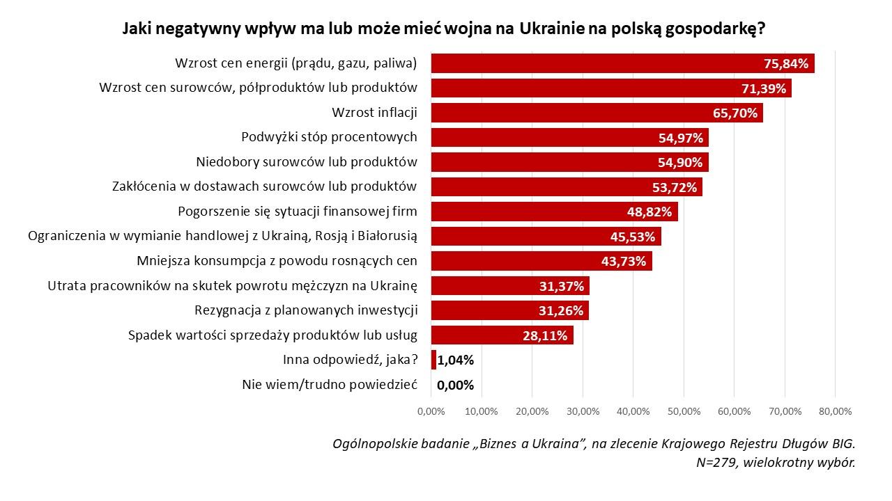 Wśród negatywnych czynników wymieniają przede wszystkim: wzrost cen energii (prądu, gazu, paliwa) – 75,8 proc., wzrost cen surowców, półproduktów lub produktów – 71,4 proc., a także wzrost inflacji (65,7 proc.) czy podwyżki stóp procentowych (55 proc.). Blisko co drugi badany (48,8 proc.) szacuje, że na skutek wojny sytuacja finansowa firm ulegnie pogorszeniu, a niemal co trzeci (31,2 proc.) zwraca uwagę na rezygnację z planowanych inwestycji.