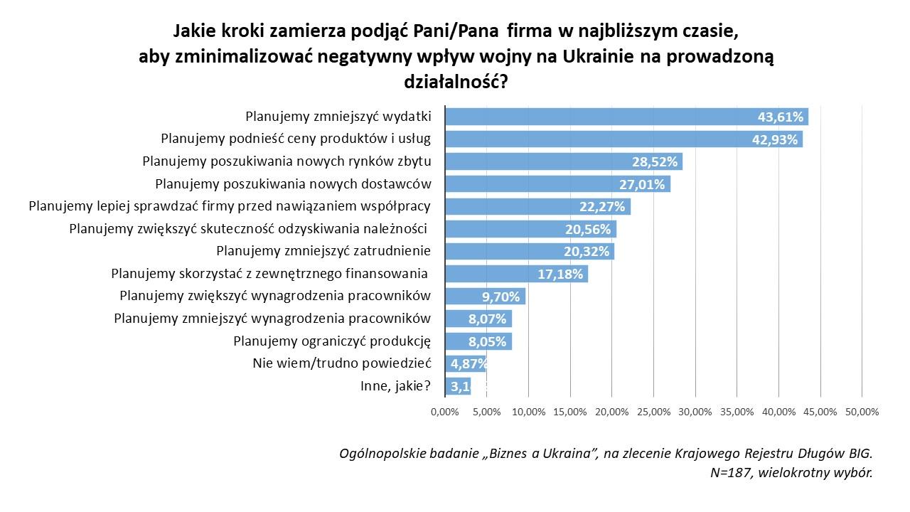 Aby zminimalizować negatywny wpływ wojny na firmę, ich właściciele zamierzają podjąć konkretne kroki: zmniejszyć wydatki (43,6 proc.) i podnieść ceny produktów i usług (42,9 proc.), a także poszukać nowych rynków zbytu (28,5 proc.) czy nowych dostawców (27 proc.). Co piąty planuje zwiększyć skuteczność odzyskiwania należności od kontrahentów (20,5 proc.), a co szósty skorzysta z zewnętrznego wsparcia finansowego jak kredyt, faktoring czy pożyczka (17,8 proc.).