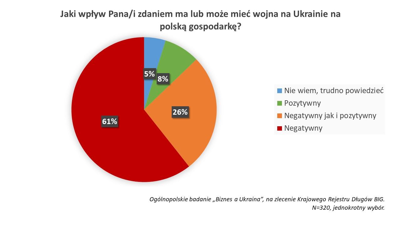 Jak pokazuje najnowsze badanie Krajowego Rejestru Długów Biura Informacji Gospodarczej „Biznes a Ukraina”, 95 proc. właścicieli polskich firm z sektora MŚP prognozuje, że trwająca wojna nie pozostanie bez wpływu na sytuację gospodarczą w naszym kraju.Większość z nich (61 proc.) jest zdania, że konflikt będzie miał negatywne skutki dla polskiej gospodarki.