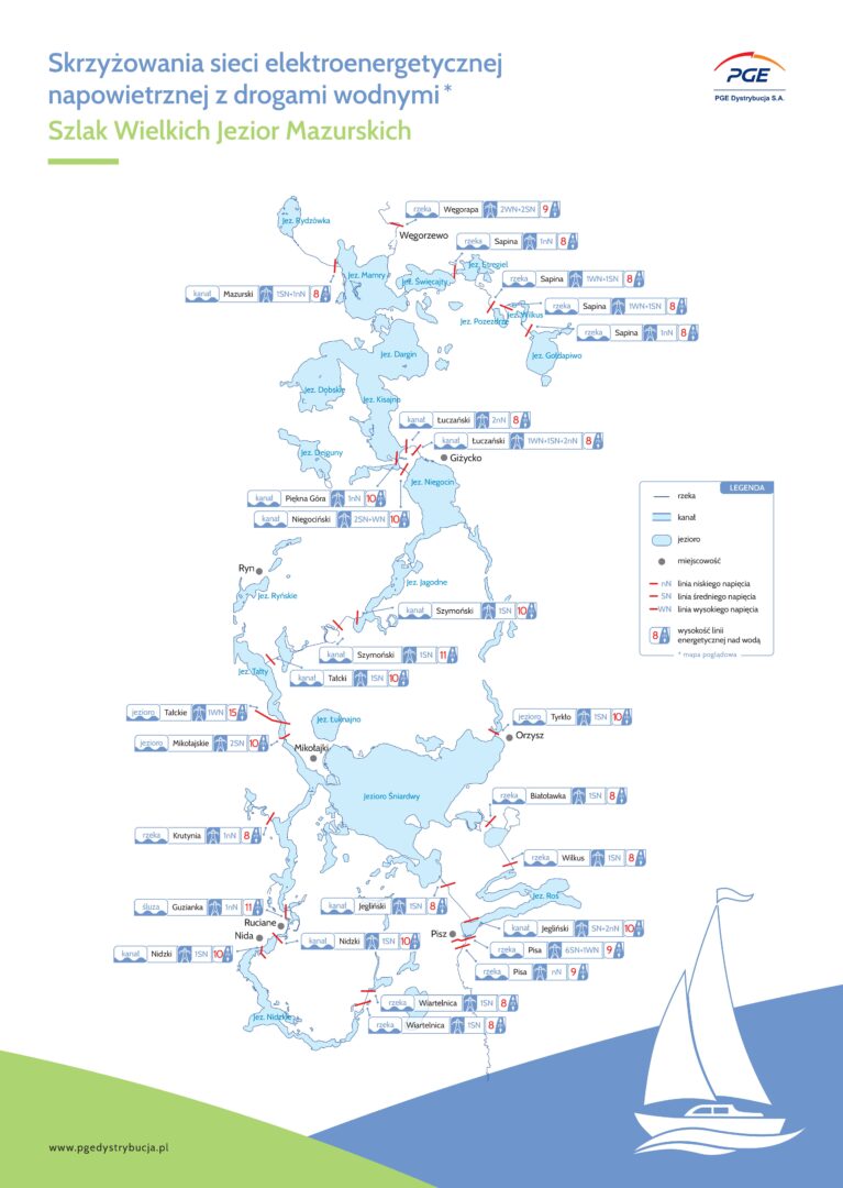 PGE Polska Grupa Energetyczna razem z Polskim Związkiem Żeglarskim opracowały mapę bezpiecznych szlaków żeglarskich z oznaczeniem miejsc, w których krzyżują się szlaki żeglowne z liniami energetycznymi. Opracowanie będzie kolportowane na Pojezierzu Mazurskim i na Suwalszczyźnie. Działania podejmowane przez PGE i PZŻ mają na celu podniesienie świadomości zarówno sterników, jak i członków załóg jachtów tak, by pływanie po jeziorach było bezpieczne.