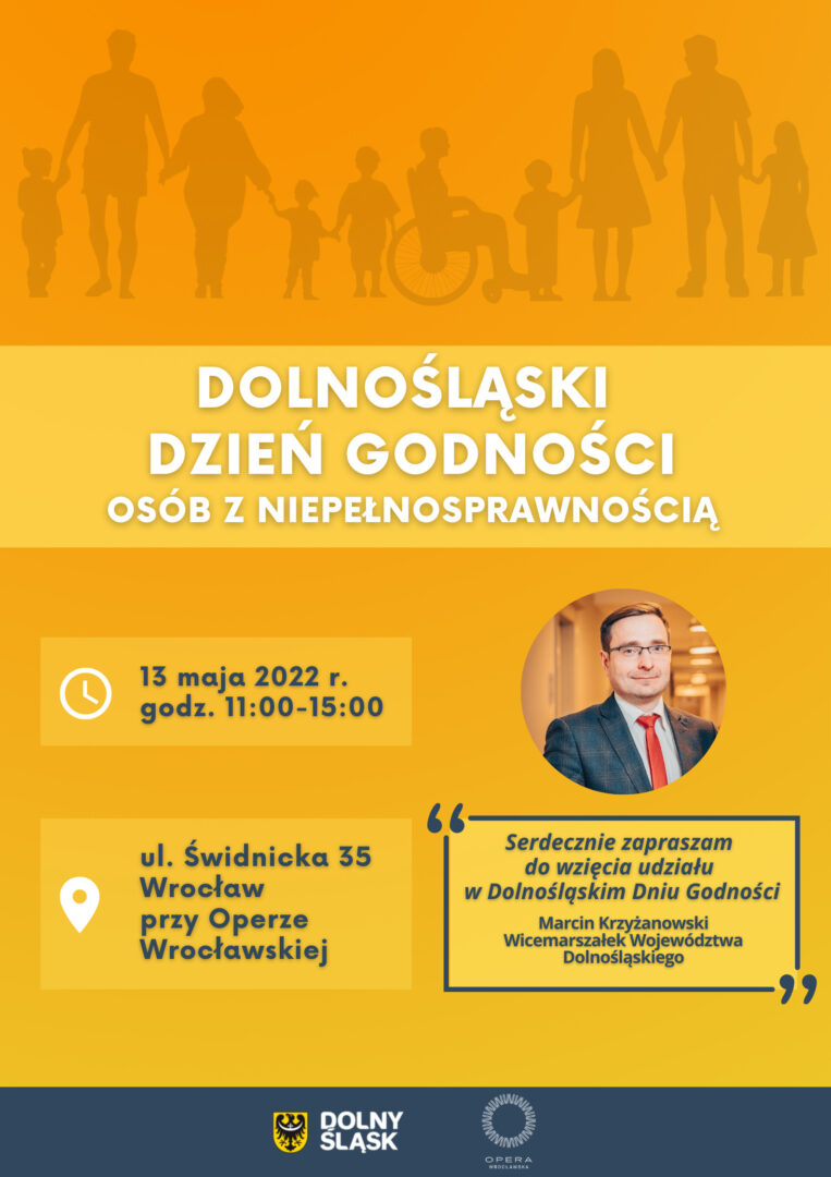 Praca, edukacja, niezależność – pod tymi hasłami w piątek 13 maja, w godzinach 11:00-15:00 odbędzie się tuż obok Opery Wrocławskiej Dolnośląski Dzień Godności Osób z Niepełnosprawnościami. Po okresie pandemii wznawiamy akcję zainicjowaną przez Marcina Krzyżanowskiego – Wicemarszałka Województwa Dolnośląskiego wraz z Departamentem Spraw Społecznych i Rynku Pracy Urzędu Marszałkowskiego. Serdecznie zapraszamy do świętowania razem z nami.