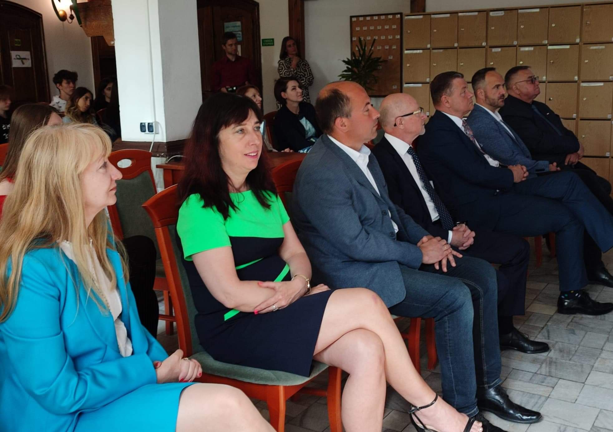 Lekcję z zainteresowaniem obserwowali przedstawiciele Zarządu i Rady Powiatu Wrocławskiego oraz urzędnicy starostwa, którzy tego dnia licznie uczestniczyli w spotkaniu. Chociaż odbyło się ono w piątek, 13 maja, to z pewnością o pechu nie może mówić dwóch uczniów, którzy w tym dniu zostali wyróżnieni specjalnymi nagrodami dla najbardziej aktywnych uczestników projektu „Klub Młodego Przedsiębiorcy”. Nagrodę rzeczową starosty Powiatu Wrocławskiego Romana Potockiego otrzymał Patryk Tennort, natomiast nagroda finansowa przewodniczącego RBPW Sławomira Hryniewicza trafiła do rąk Oliwii Medyńskiej. Wszyscy uczestnicy projektu otrzymali pamiątkowe certyfikaty i drobne upominki.