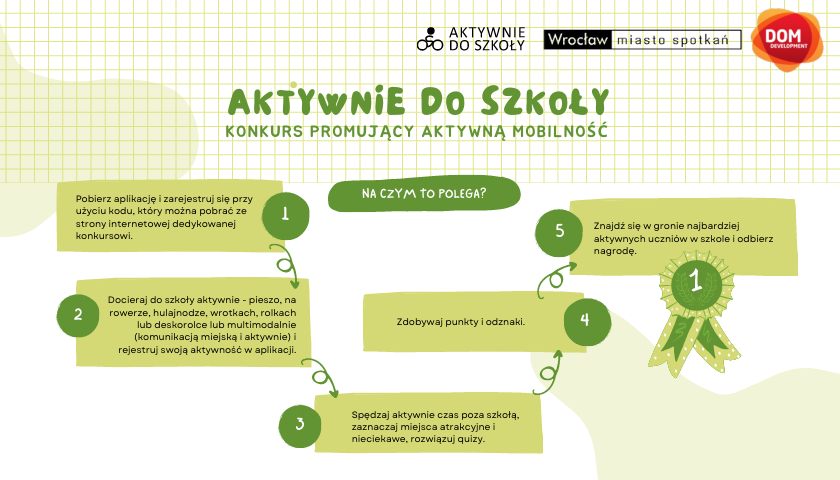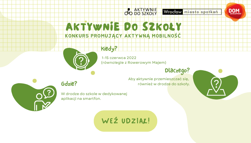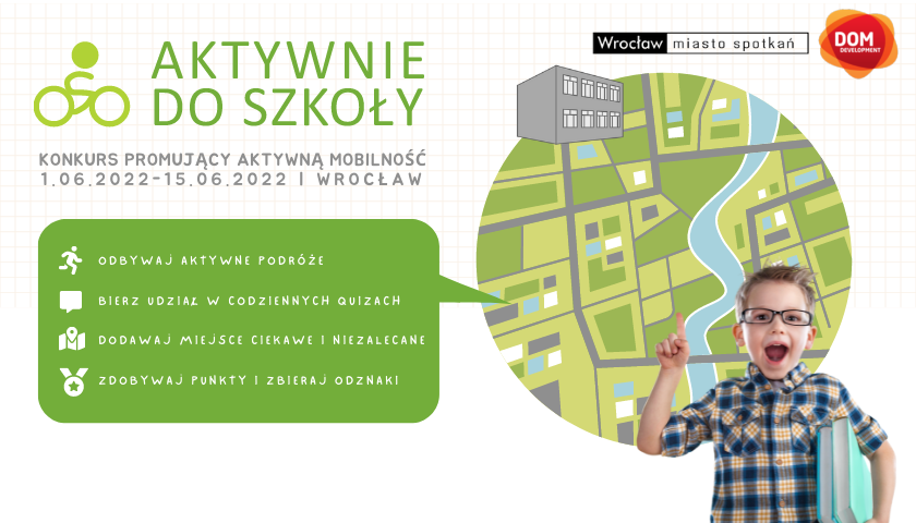 Aby dołączyć do projektu, należy pobrać aplikację „Aktywnie do szkoły”, wygenerować specjalny kod, który będzie przypisany do każdego użytkownika, a następnie rejestrować swoje podróże. Wymagana jest również zgoda rodzica lub opiekuna prawnego na udział dziecka w tej akcji.– Chętnie angażujemy się w prospołeczne i proekologiczne aktywności skierowane do mieszkańców Wrocławia, często we współpracy z magistratem lub instytucjami z nim związanymi. W ubiegłym roku m.in. wsparliśmy miejski projekt Rowerowy Maj, sponsorując atrakcyjne nagrody dla laureatów. Teraz ponownie wspólnymi siłami z miastem, będziemy zachęcać uczniów do wyboru aktywnej drogi do szkoły. Trzymamy kciuki za wszystkich uczestników! – mówi Iwona Kołodziejczyk, prezes Dom Development Wrocław, partnera akcji.