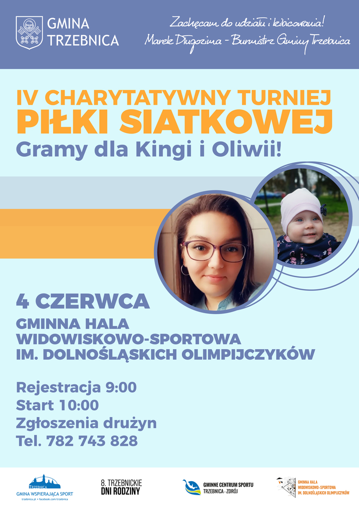 Burmistrz Trzebnicy zaprasza do udziału w charytatywnym turnieju siatkarskim, podczas którego będą zbierane środki dla Kingi, która choruje na stwardnienie rozsiane oraz malutkiej Oliwii, która potrzebuje rehabilitacji.