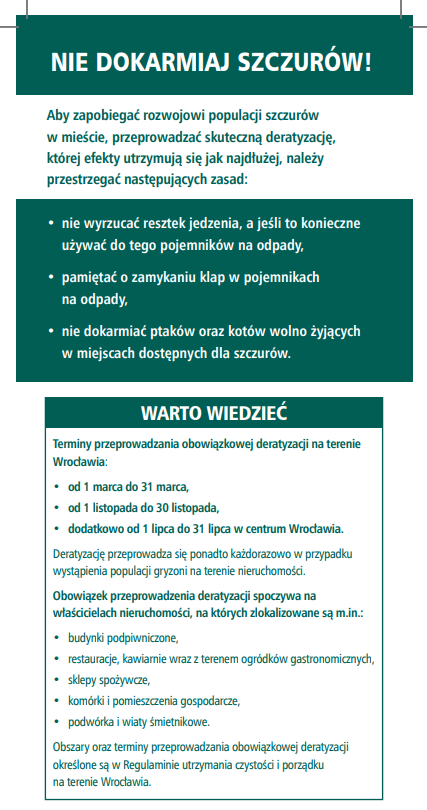 30 czerwca 2022Letnia deratyzacja obejmuje centrum Wrocławia, tj. obszar ograniczony rzeką Odrą, mostem Milenijnym, ul. Milenijną, ul. Na Ostatnim Groszu, estakadą Gądowianką, ul. Klecińską, ul. Petuniową, al. Gen. Hallera, al. Armii Krajowej, Lasem Rakowieckim oraz Starą Odrą.