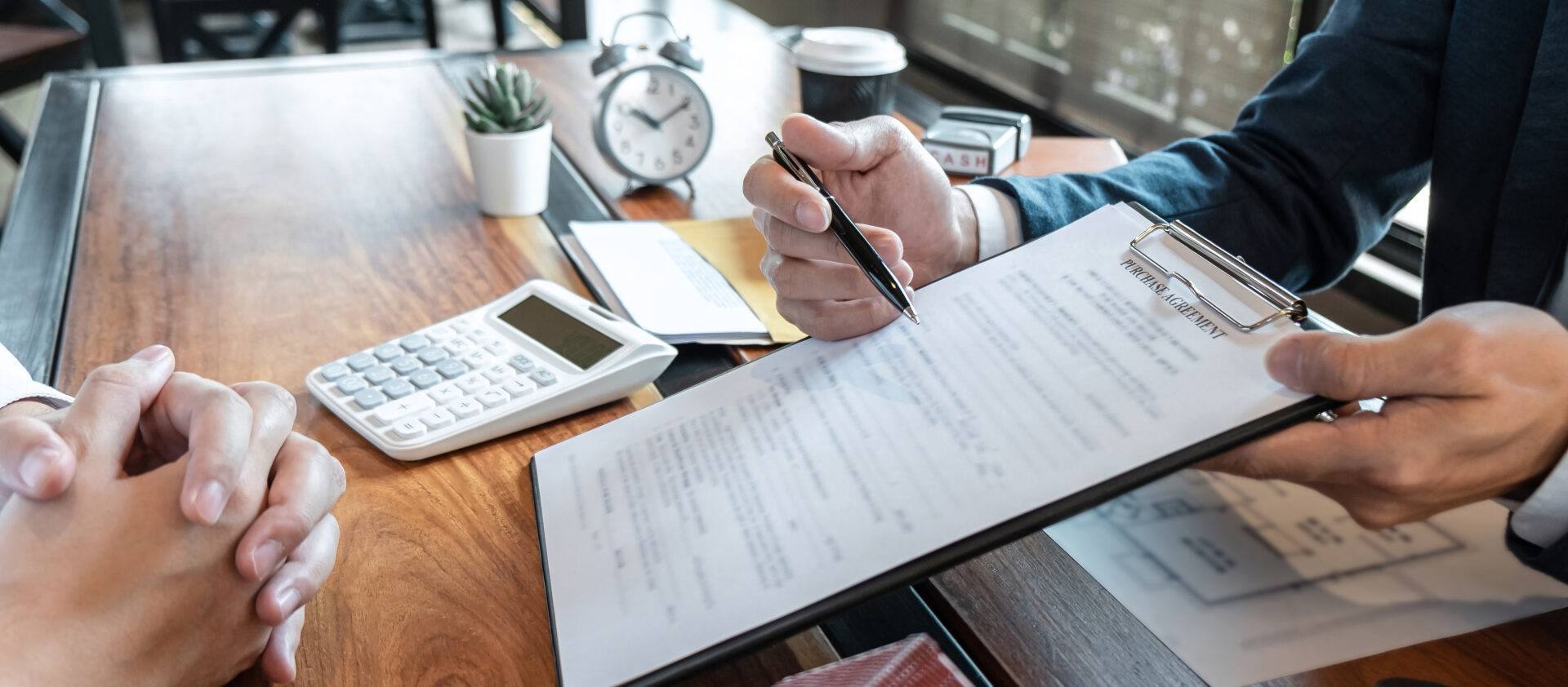 Sale purchase contract to buy a house, Real estate agent are presenting home loan and giving keys to customer after signing contract to buy house with approved property application form.