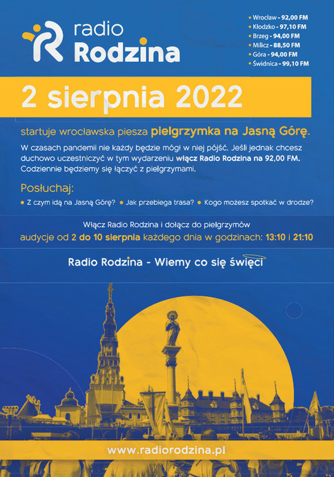 Wydarzenie rozpocznie się 2 sierpnia o godz. 6:00 Mszą Świętą w Katedrze Wrocławskiej. Pątnicy wyruszą pierwszego dnia do Trzebnicy. Relacje z trasy pojawią się w Studiu Pielgrzymkowym Radia Rodzina.