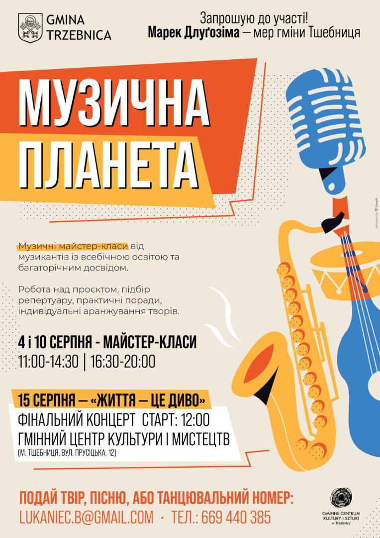 Gmina Trzebnica zaprasza do wzięcia udziału w wydarzeniu „Muzyczna Planeta”. Uczestnicy warsztatów mają okazję doskonalić swoje umiejętności pod okiem profesjonalnych muzyków. Efekt warsztatów zobaczymy 15 sierpnia na scenie Kina Polonia podczas koncertu „Życie cudem jest”.