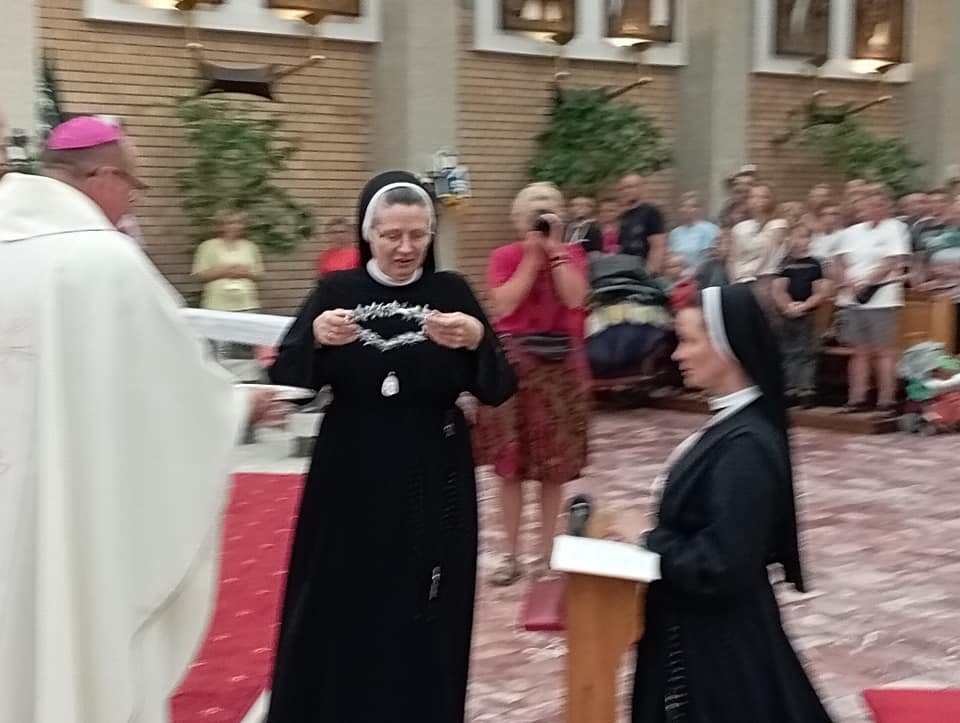 Bp Kiciński przypomniał, że 25 lat temu s. Maria Czepiel złożyła pierwsze śluby – czystości, ubóstwa i posłuszeństwa. – Została zaproszona na wejście na Górę Tabor z Jezusem Chrystusem. A na Górze Tabor mówił: Tyś jest moją umiłowaną, w tobie mam upodobanie. S. Maria podzieliła się później z pielgrzymami swoim świadectwem życia i powołania: