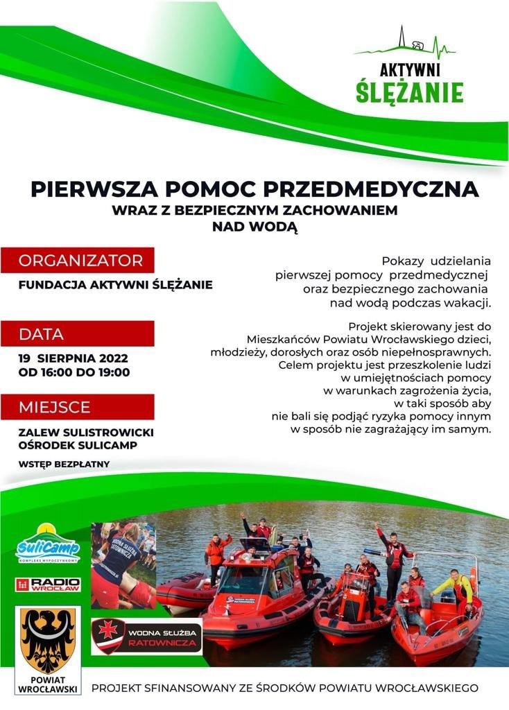 Fundacja Aktywni Ślężanie serdecznie zaprasza do SuliCamp – Kompleks Wypoczynkowy w Sulistrowicach, gdzie już 19 sierpnia odbędzie się Pierwsza Pomoc Przedmedyczna wraz z bezpiecznym zachowaniem nad wodą.