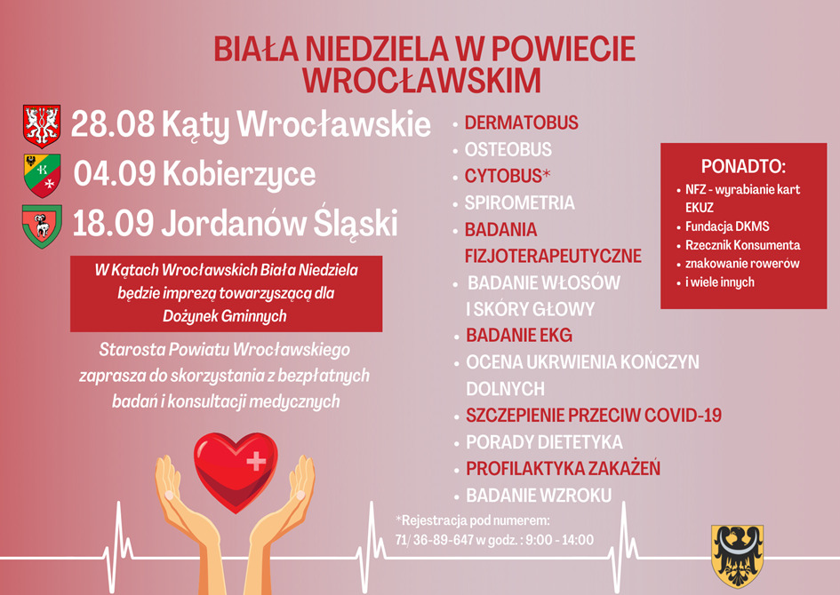 Końcówka wakacji w Starostwie Powiatowym upływa pod hasłem Białych Niedziel. Osoby, które chcą się przebadać mogą skorzystać z bezpłatnych badań w Kątach Wrocławskich (28.08), Kobierzycach (04.09) czy Jordanowie Śląskim (18.09). Rozmawiamy także o dożynkach, warsztatach z pierwszej pomocy przedmedycznej i aktualności drogowych.