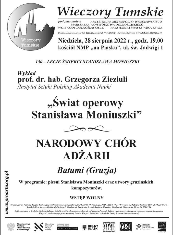Zapraszamy serdecznie na sierpniowy Wieczór Tumski poświęcony 150-leciu śmierci Stanisława Moniuszki. W niedzielę 28 sierpnia o godzinie 19:00, w kościele NMP „na Piasku” usłyszmy wykład prof. dr. hab. Grzegorza Zieziuli z Instytutu Sztuki Polskiej Akademii Nauk zatytułowany „Świat operowy Stanisława Moniuszki”.