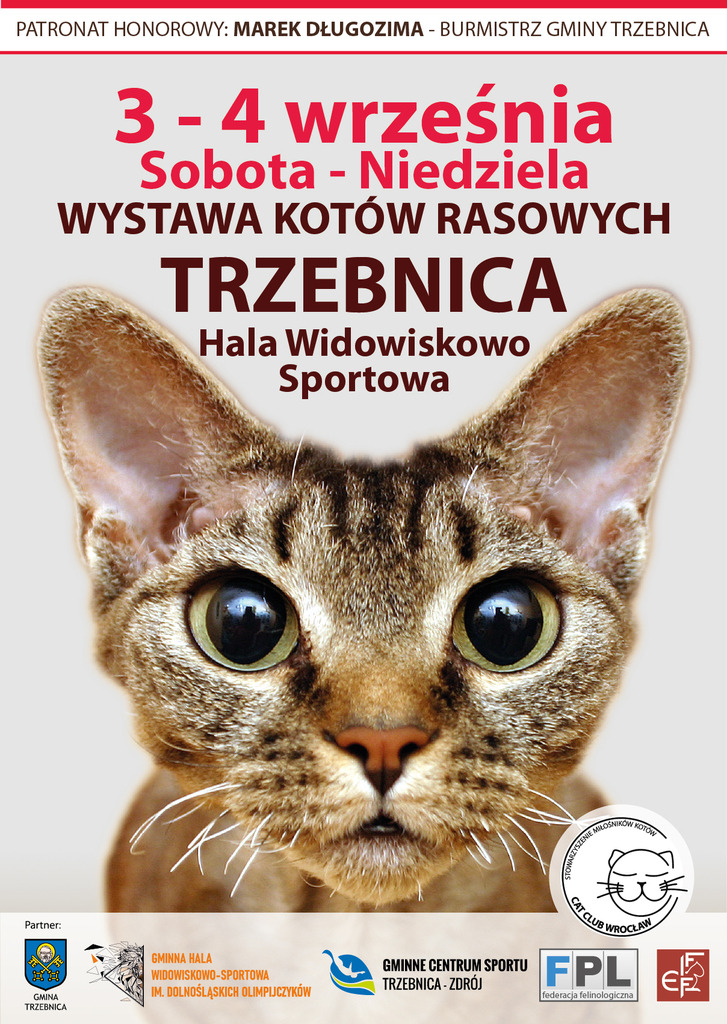 Odwiedź nas w Hali Widowiskowo Sportowej w Trzebnicy i poznaj koty burmskie, bengalskie, największe północnoamerykańskie Main Coon, syjamskie i orientalne, święte birmańskie , koty UFO rex, bezwłose Sfinksy oraz wiele, wiele innych ciekawych ras.