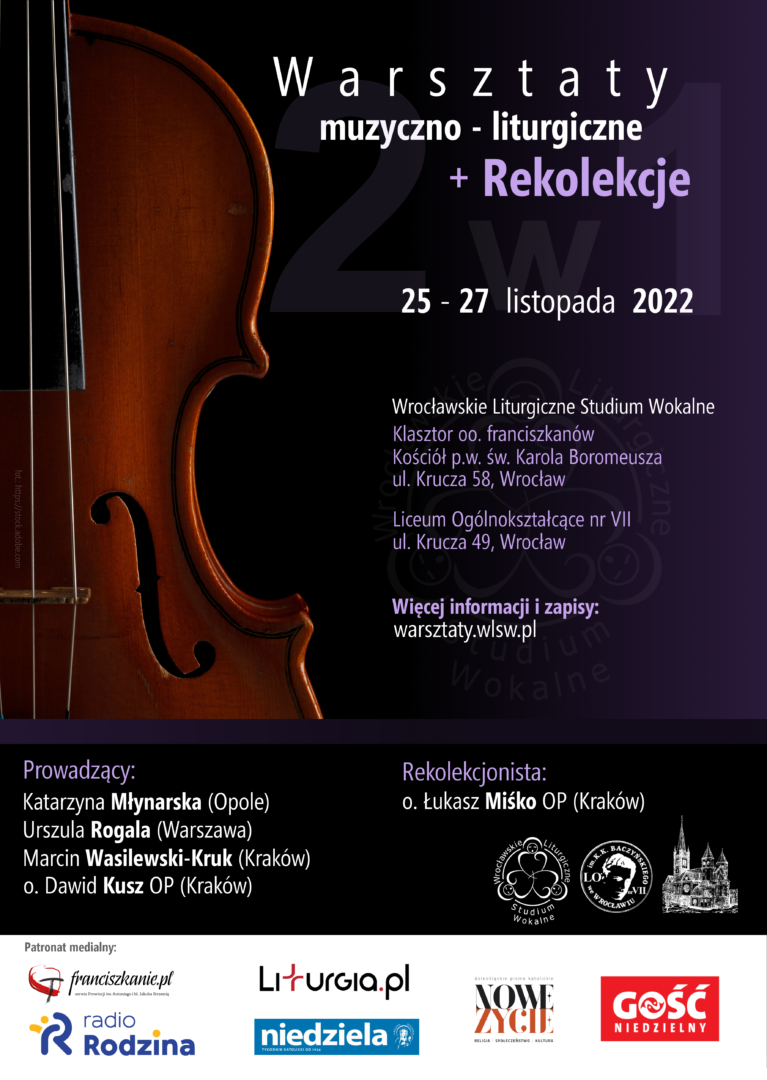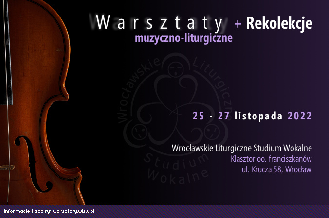 Wrocławskie Liturgiczne Studium Wokalne zaprasza na Warsztaty Muzyczno-Liturgiczne i Rekolekcje, które odbędą się w dniach 25-27 listopada przy klasztorze oo. franciszkanów przy ul. Kruczej we Wrocławiu.