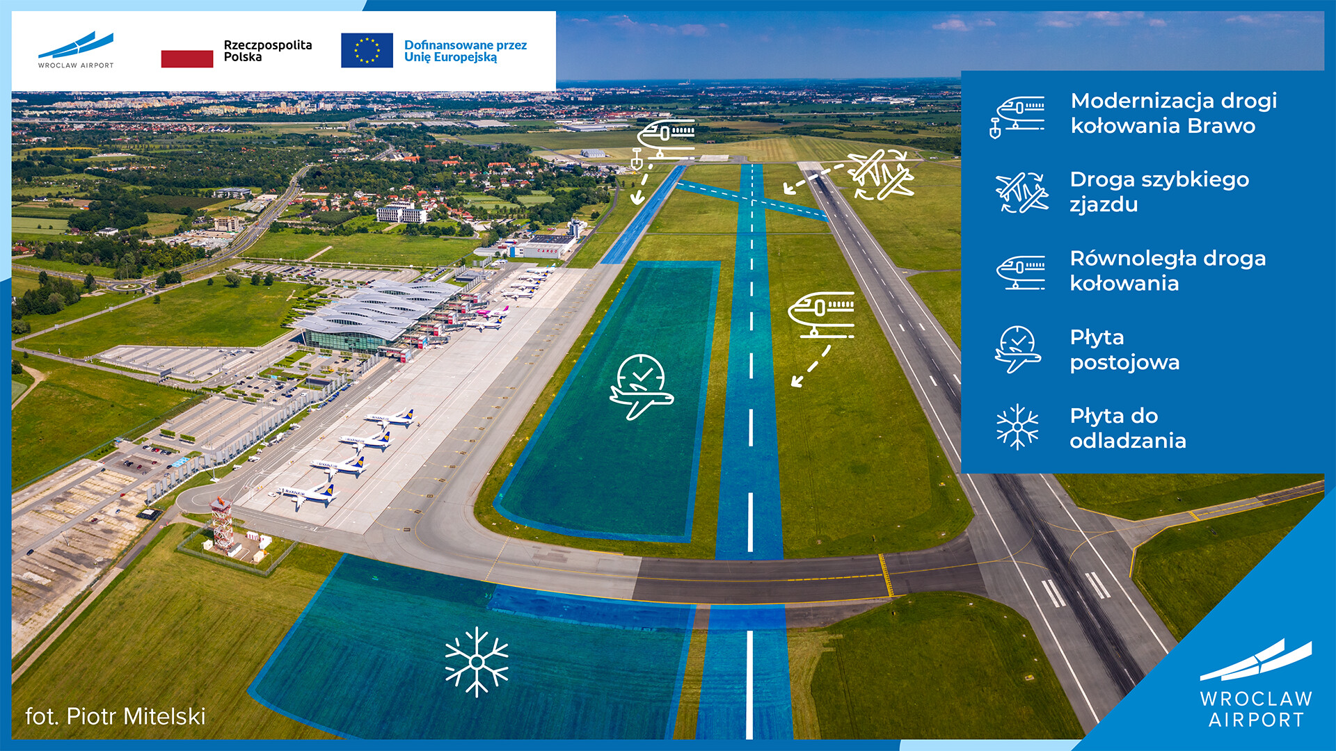 Do 2024 roku Port Lotniczy we Wrocławiu ulepszy strefę operacyjną lotniska. Nowa infrastruktura zwiększy przepustowość, usprawni obsługę samolotów i poprawi cywilno-wojskowe zastosowania portu.