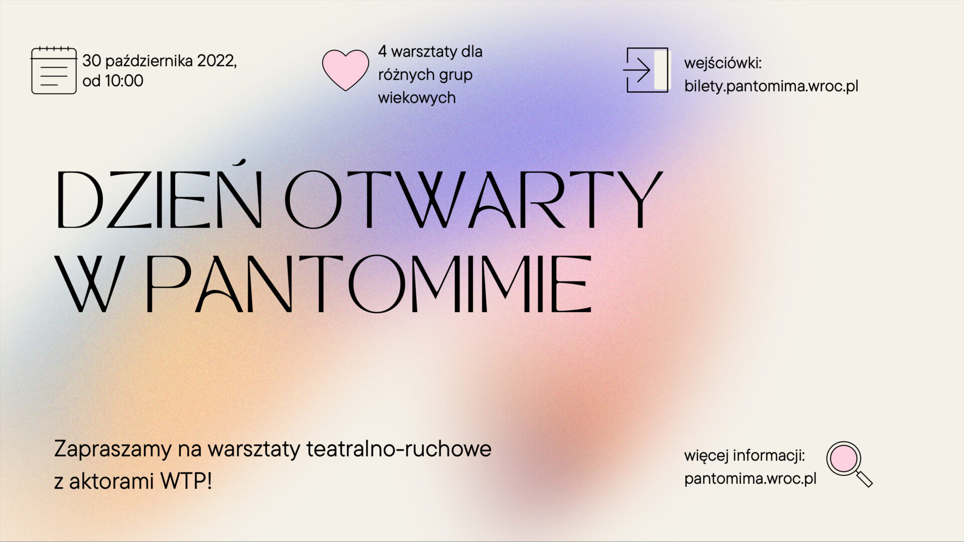 Wrocławski Teatr Pantomimy 30 października 2022 roku organizuje Dzień Otwarty. Dzieci z opiekunami, młodzież, dorośli i seniorzy będą mieć okazję, by w czasie prowadzonych w tym dniu warsztatów poznać techniki i metody pracy artystów. Wszystko odbędzie się w siedzibie WTP przy alei Dębowej 16, start wydarzenia od 10:00.