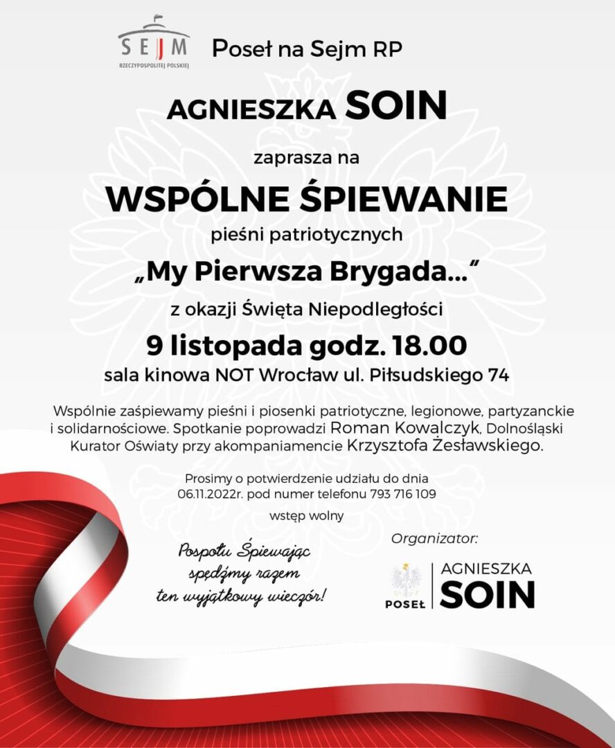 8 listopada 2022W sali kinowej NOT Wrocław przy ul. Piłsudskiego odbędzie się wspólne śpiewanie pieśni i piosenek patriotycznych, partyzanckich, solidarnościowych. Spotkanie poprowadzi Roman Kowalczyk – Dolnośląski Kurator Oświaty przy akompaniamencie Krzysztofa Żesławskiego.