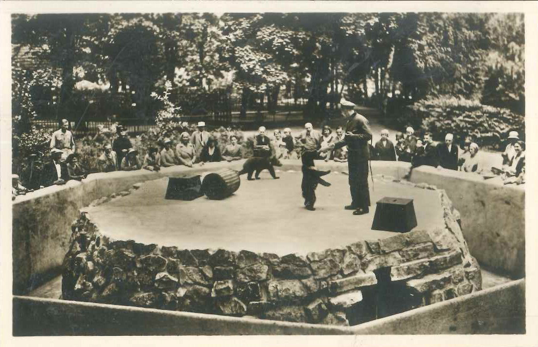 Oprócz Baszty Niedźwiedzi widać m.in. restaurację z salą koncertową (dziś Terrarium). Był to budynek mogący gościć ponad 700 osób. Są także pocztówki przedstawiające Ptaszarnię, Domek Jeleni, Małpiarnię, a także stary Mały Pawilon Drapieżców (były w nim eksponowane małe drapieżniki, obecnie budynek nie istnieje).