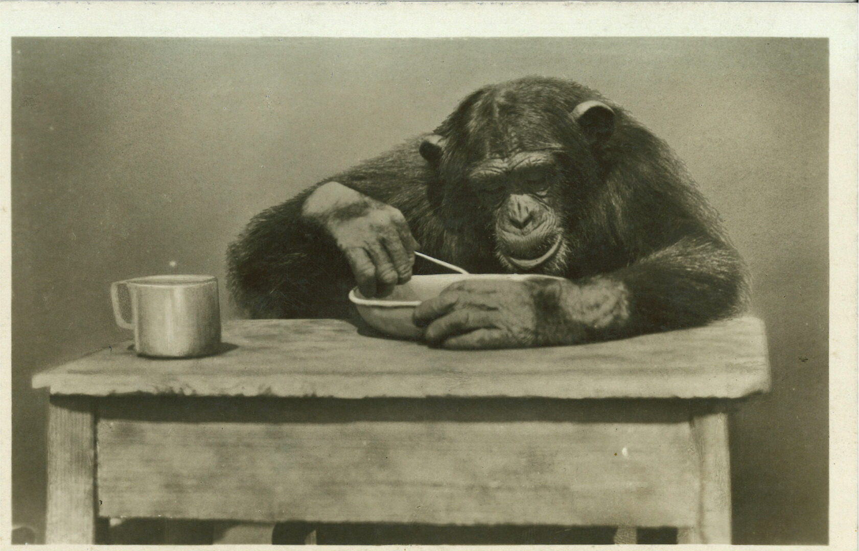 Archiwalne ilustracje pokazują stare wybiegi i pawilony oraz pracę opiekunów. Na zdjęciach jest widoczny między innymi szympans Moritz (na zdjęciu z innym szympansem i z opiekunem). Przybył do zoo w 1931 roku z Berlina jako 1,5 roczny samiec. Przeżył wojnę, w 1945 roku został przewieziony do Łodzi. Po ponownym otwarciu zoo po wojnie nie został zwrócony przez łódzkie zoo (stwierdzono, że padł. W rzeczywistości żył jeszcze kilka lat). Obecność Moritza na pocztówce może świadczyć, że album był w posiadaniu kolejnych dyrektorów i był uzupełniany (Grabowski zmarł w 1929 roku). Moritz to także ten szympans siedzący przy stole z kubkiem i talerzykiem. Mpongo to drugi szympans widoczny na pocztówkach, samiec który przybył do zoo w 1901 roku gdy miał 3 lata i padł w 1906 roku.