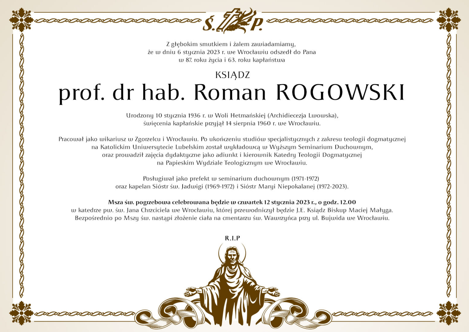 Msza pogrzebowa ks. prof. Romana Rogowskiego odbędzie się w czwartek 12 stycznia o godz. 12:00 w Katedrze im. Jana Chrzciciela we Wrocławiu. Mszy przewodniczyć będzie Bp Maciej Małyga. Ciało zmarłego spocznie na cmentarzu przy ul. Bujwida.