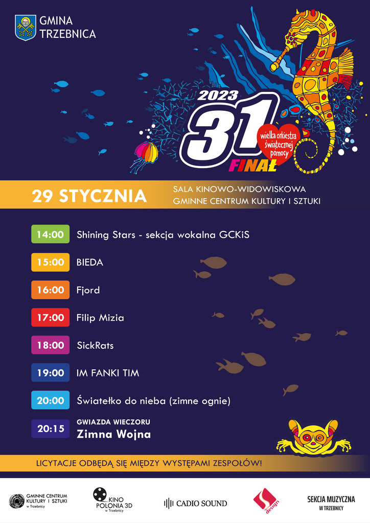 Gmina Trzebnica po raz kolejny dołącza do akcji. Startujemy o 14:00 w sali kinowo – widowiskowej GCKiS. Szczegółowe informacje i ważne treści pojawiają się na fanpage’u Trzebnickiego Sztabu WOŚP dostępnego tutaj oraz w wydarzeniu, do którego możecie dołączyć.