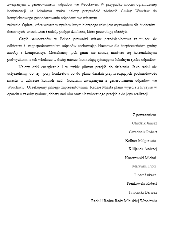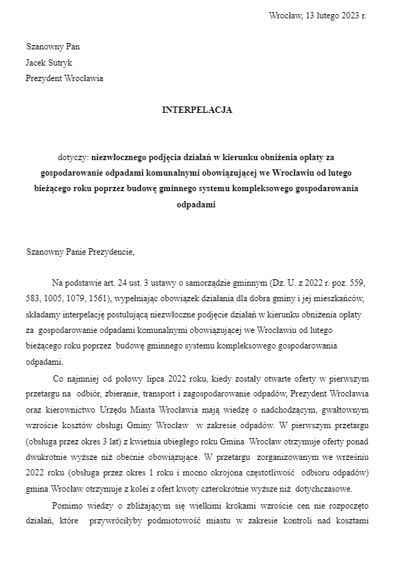 Wrocławscy radni z Prawa i Sprawiedliwości chcą złożyć interpelacje do Prezydenta Wrocławia o „niezwłoczne podjęcie działań w kierunku obniżenia opłaty za gospodarowanie odpadami komunalnymi obowiązującej we Wrocławiu od lutego bieżącego roku poprzez budowę gminnego systemu kompleksowego gospodarowania odpadam”. Zdaniem radnych najlepszym rozwiązaniem będzie uruchomienie gminnego systemu gospodarowania odpadami.