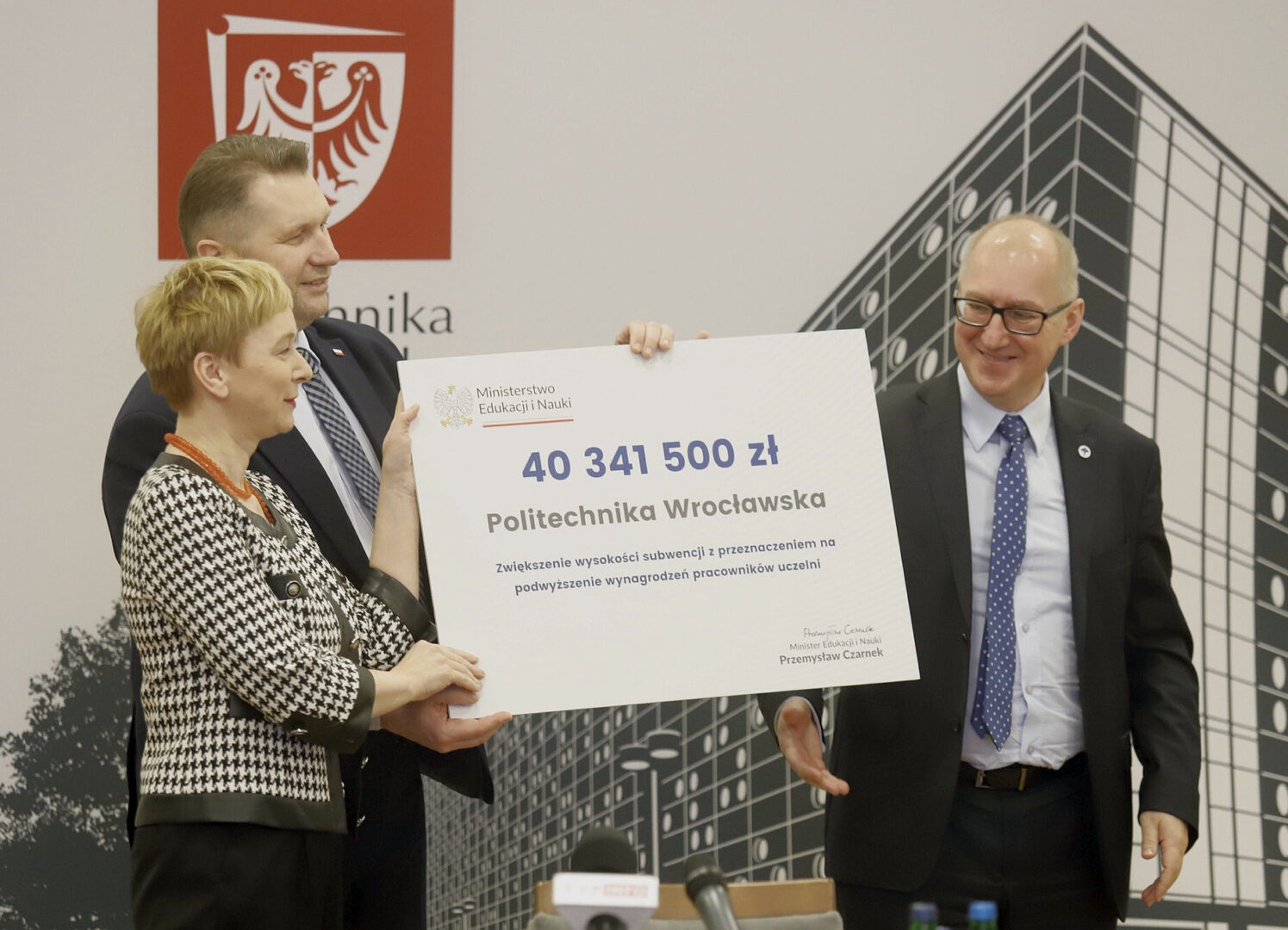 Ministerstwo Edukacji i Nauki zwiększyło subwencję na wynagrodzenia dla pracowników o blisko 1 mld 700 mln złotych. Na poziomie minimalnym jest to o 12,5 proc. więcej. Symboliczny czek trafił na Politechnikę Wrocławską.