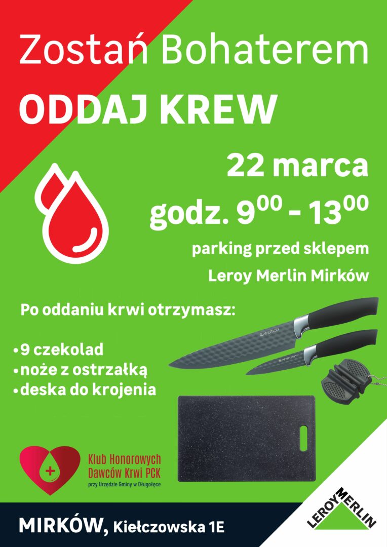 Wspólnie z Leroy Merlin GIGA-MARKET Mirków serdecznie zapraszamy do wzięcia udziału w kolejnej akcji oddawania krwi na terenie Gminy Długołęka. Odbędzie się ona 22 marca w godz. 9-13 przy Leroy Merlin w Mirkowie przy ul. Kiełczowskiej 1e. Przypominamy, że zgodnie z obowiązującym obecnie prawem, za oddanie krwi przysługują dwa dni wolnego (dzień oddawania krwi i dzień następny). Nasz partner po raz kolejny przygotował specjalne upominki dla naszych Krwiodawców.
