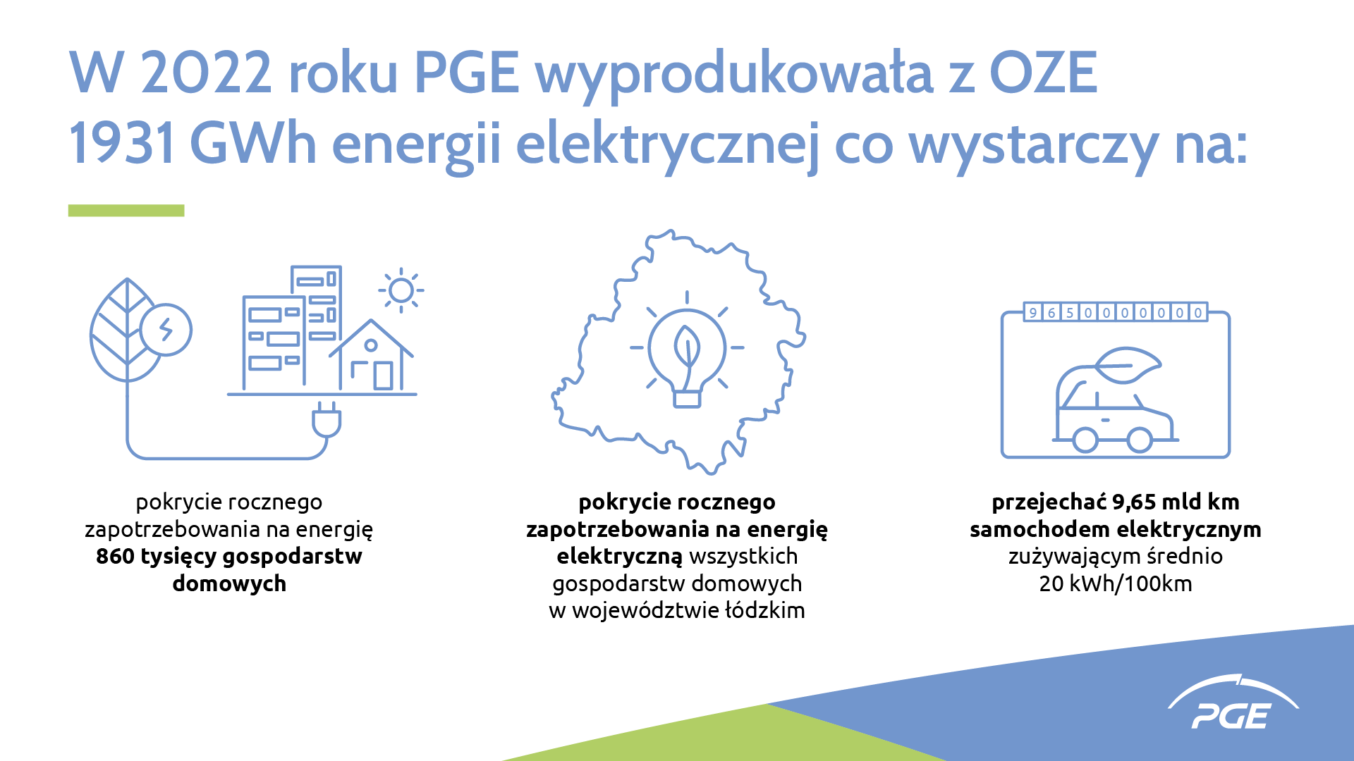 Tylko w 2022 r. energia produkowana przez PGE Polską Grupę Energetyczną ze źródeł odnawialnych osiągnęła rekordowy poziom 1 931 GWh – o 5,3 proc. więcej niż rok wcześniej. Lider zielonej transformacji energetycznej w Polsce jest już w stanie pokryć energią z OZE roczne zapotrzebowanie 860 tys. gospodarstw domowych. Wynik produkcji OZE osiągnięty przez PGE w ub.r. byłby w stanie przez cały rok zapewniać energię elektryczną dla wszystkich mieszkańców województwa łódzkiego.