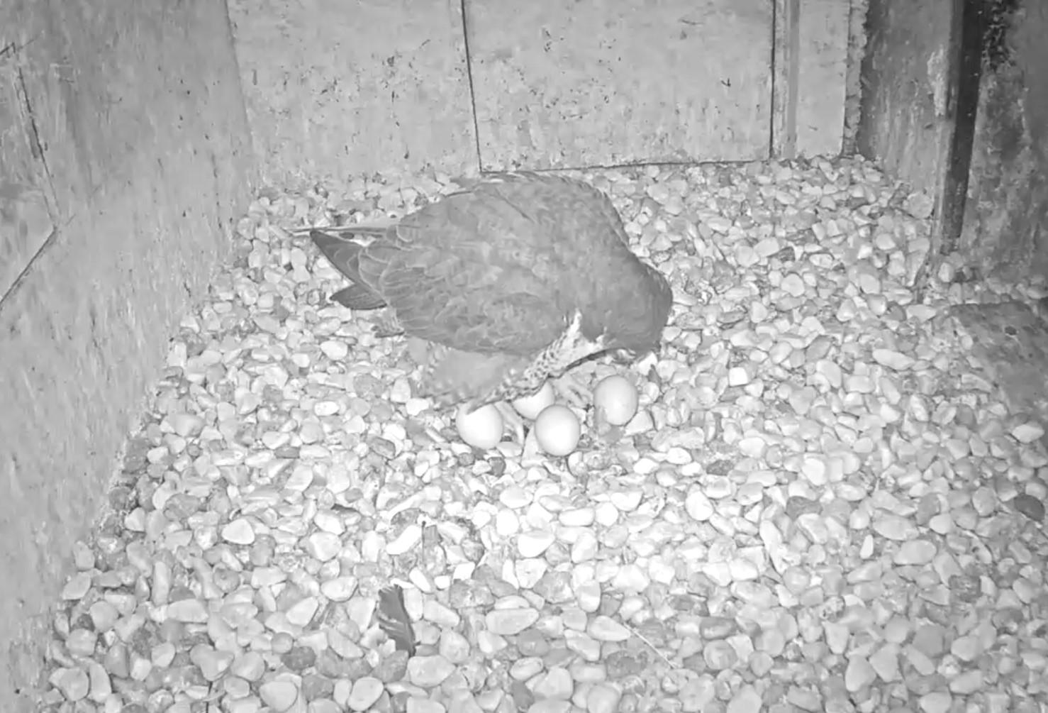 W gnieździe na kominie Huty Miedzi Głogów są już 4 jaja sokoła – czy będzie kolejne?