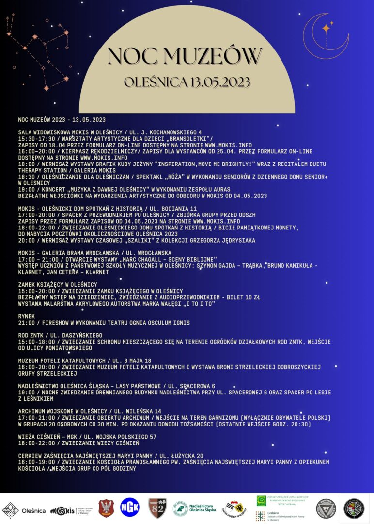 Miejski Ośrodek Kultury i Sztuki w Oleśnicy zaprasza na Noc Muzeów, która w tym roku odbędzie się 13.05.2023. Miejskie instytucje kultury i sztuki organizują wydarzenia dedykowane zarówno najmłodszym, jak i seniorom i nie tylko.