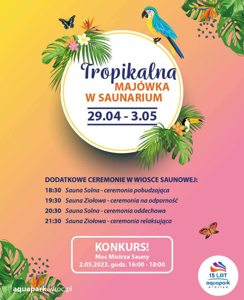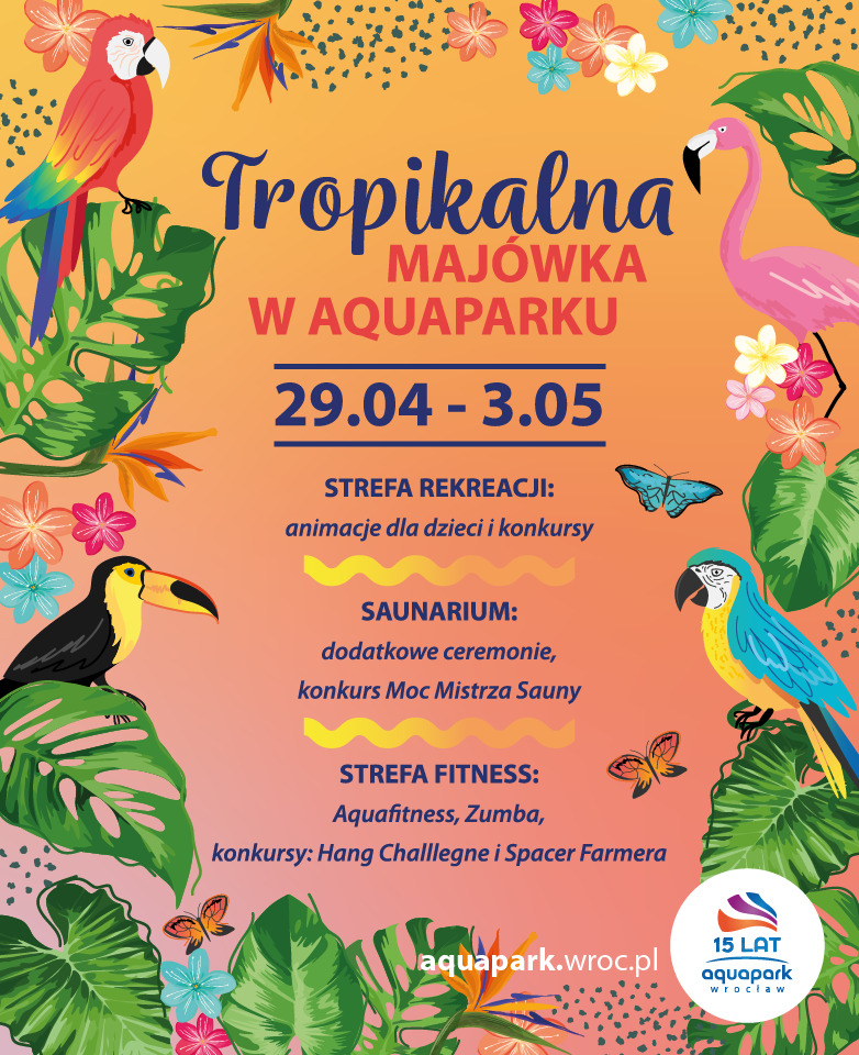 Na Tropikalną Majówkę Aquapark Wrocław zaprasza w dniach 29.04 – 3.05.2023 przy ul. Borowska 99.
