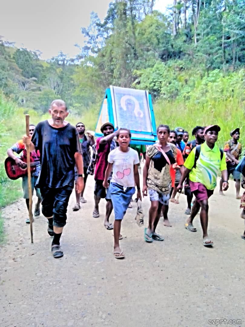 Droga wiedzie przez busz, góry, małe wioski. Na froncie Maryja, jej obraz, niesiony przez pielgrzymów na lektyce. Kapłanowi towarzyszy liczna grupa, w tym stałe 25 osób. Wędrują kilkaset kilometrów.