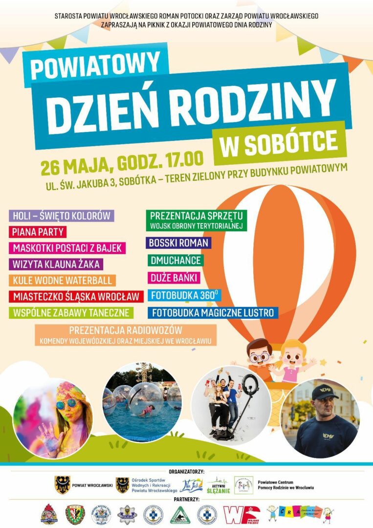 Starosta Powiatu Wrocławskiego Roman Potocki i Dyrektor OSWiRPW Hubert Kurdziel, zapraszają na Powiatowy Dzień Rodziny, który odbędzie się 26 maja od godziny 17:00 przy ulicy Św. Jakuba 3 w Sobótce.