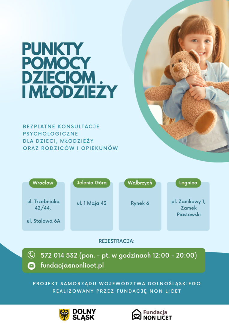 Na Dolnym Śląsku ruszyły cztery Punkty Pomocy Dzieciom i Młodzieży doświadczającej przemocy – projekt Samorządu Województwa Dolnośląskiego realizowany we współpracy z Fundacją NON LICET i polegający na bezpłatnych konsultacjach psychologicznych dla dzieci, młodzieży oraz ich opiekunów. takie punkty pojawią się m.in. w Wałbrzychu i Legnicy