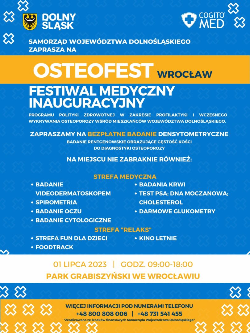 1 lipca 2023 r. od godziny 9:00 do 18:00, na polanie w Parku Grabiszyńskim odbędzie się Osteofest. Głównym celem festiwalu jest przeprowadzenie bezpłatnych badań densytometrycznych obrazujących gęstość kości. Ponadto mieszkańcy będą mogli skorzystać z innych badań profilaktycznych: badań cytologicznych, badań wzroku, badań płuc, badania krwi, testy PSA, badania w kierunku dny moczanowej, badania cholesterolu. Do dyspozycji będzie również kino letnie, strefa gastronomiczna i strefa FUN dla dzieci.