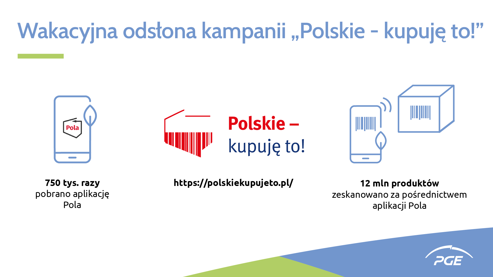 W ramach wakacyjnej odsłony kampanii społecznej „Polskie – kupuję to!”, PGE przygotowała animację do mediów społecznościowych, w której zachęca konsumentów do wyposażenia szkolnych tornistrów w polskie produkty. W tym celu udostępnia dedykowaną aplikacja „Pola. Zabierz ją na zakupy”, która w przystępny sposób umożliwia identyfikację polskich producentów i marek.