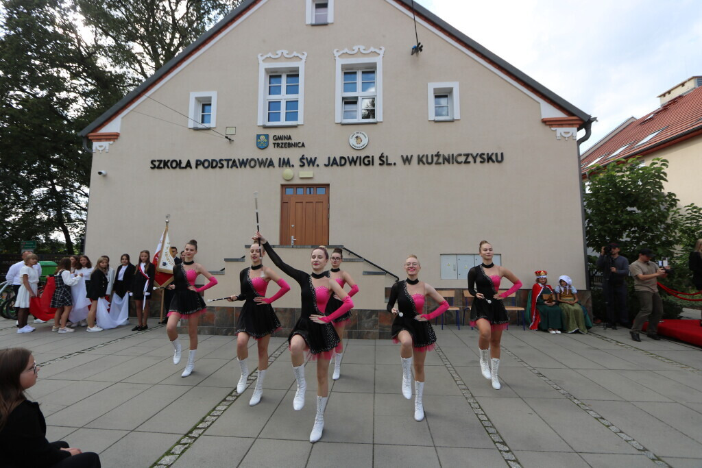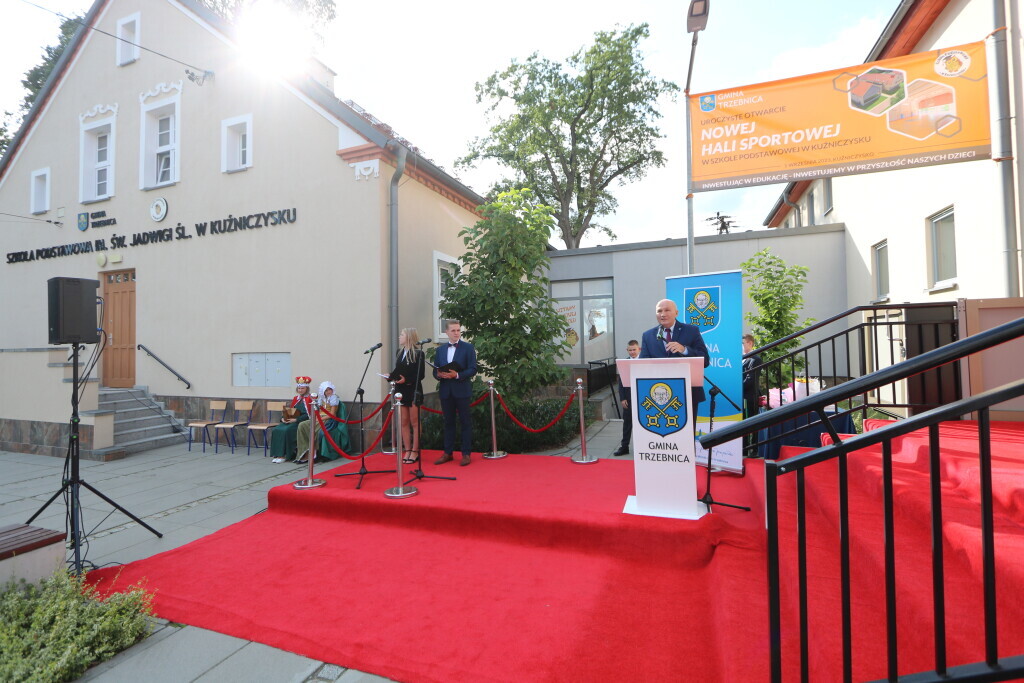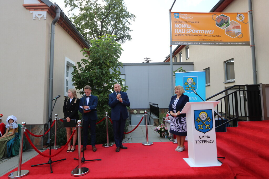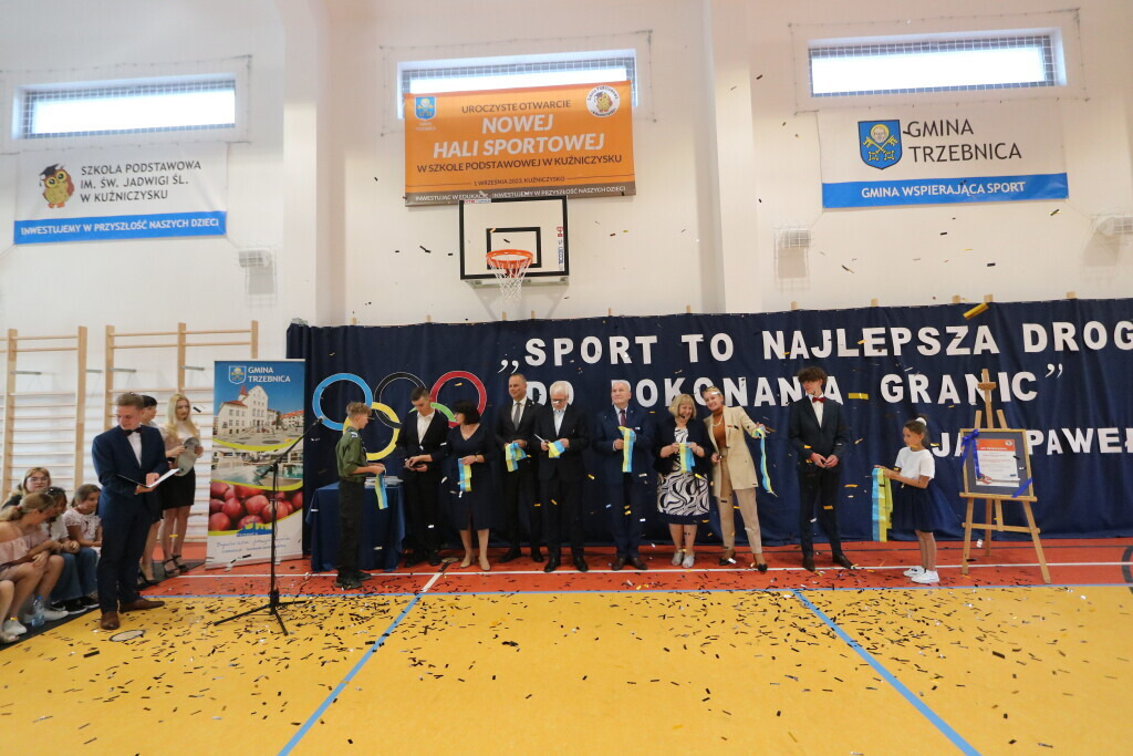 Druga cześć uroczystości odbyła się już w nowej hali sportowej, gdzie oficjalnego jej otwarcia wraz z symbolicznym przecięciem wstęgi dokonali: Burmistrz Gminy Trzebnica Marek Długozima, Wojewoda Dolnośląski Jarosław Obremski, Poseł na Sejm RP Agnieszka Soin, Poseł na Sejm RP Paweł Hreniak, dyrektor Elżbieta Taraszczuk-Gaweł, nowa dyrektor Szkoły Podstawowej w Kuźniczysku Dorota Surówka oraz uczniowie: Piotr Okarmus z klasy VII i Miłosz Iwanicki z klasy VIII. Następnie obiekt został poświęcony przez proboszcza ks. Jacka Tomaszewskiego. Ważnym momentem było również wręczenie dyrektor Elżbiecie Taraszczuk-Gaweł Aktu Przekazania hali. – Uroczyście przekazuję nową halę sportową przy Szkole Podstawowej w Kuźniczysku. Wierzę, że nowy obiekt pozwoli przeżyć wiele niezapomnianych chwil podczas imponujących wydarzeń sportowych i kulturalnych oraz umożliwi rozwój sportowych pasji. Niech ta nowa inwestycja posłuży kolejnym pokoleniom – powiedział burmistrz, przekazując akt pani dyrektor.