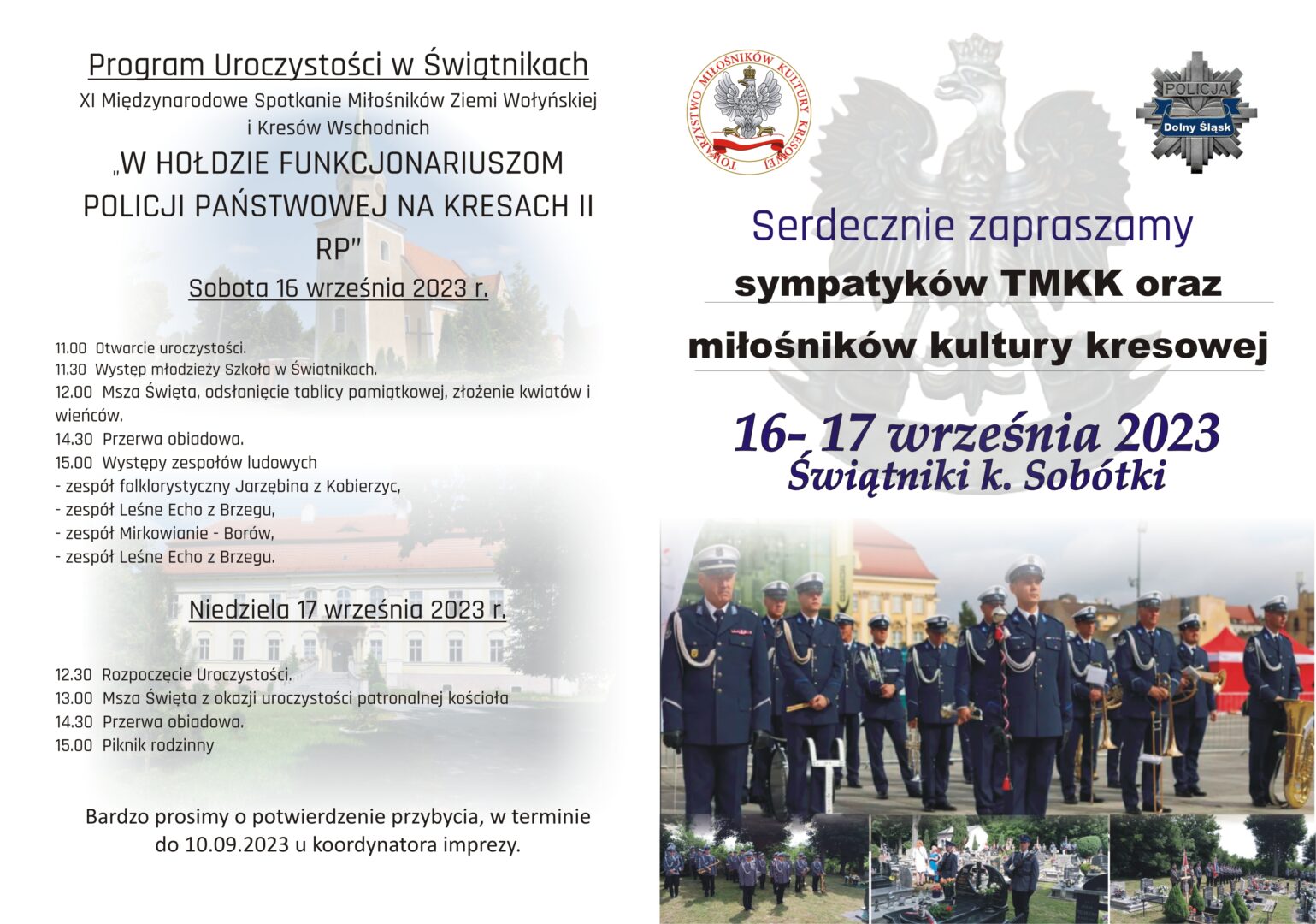 Towarzystwo Miłośników Kultury Kresowej oraz Komenda Wojewódzka Policji we Wrocławiu zapraszają do udziału w uroczystościach 16-17 września w Świątnikach k. Sobótki. Będzie to już XI Międzynarodowe Spotkanie Miłośników Ziemi Wołyńskiej i Kresów Wschodnich.