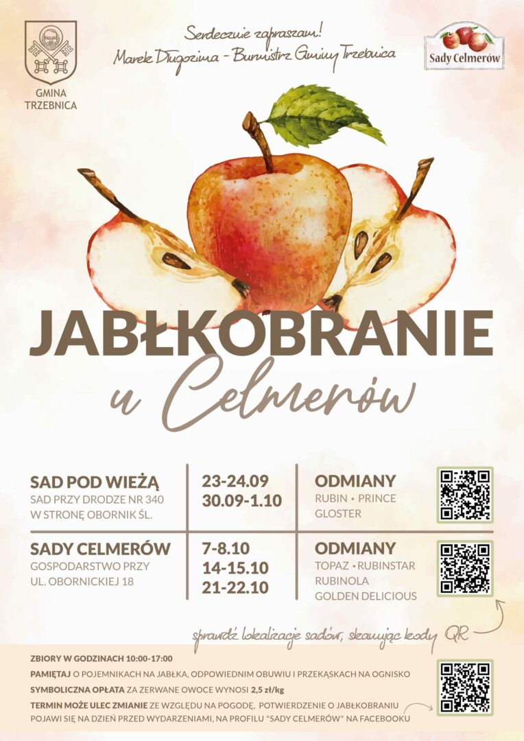 Burmistrz Gminy Trzebnica Marek Długozima zaprasza na kolejną edycję Jabłkobrania u Celmerów. W tym roku na chętnych czekają 2 różne lokalizacje sadów i sporo odmian jabłek do wyboru. Organizatorzy postarają się, aby na każdym jabłkobraniu paliło się ognisko.