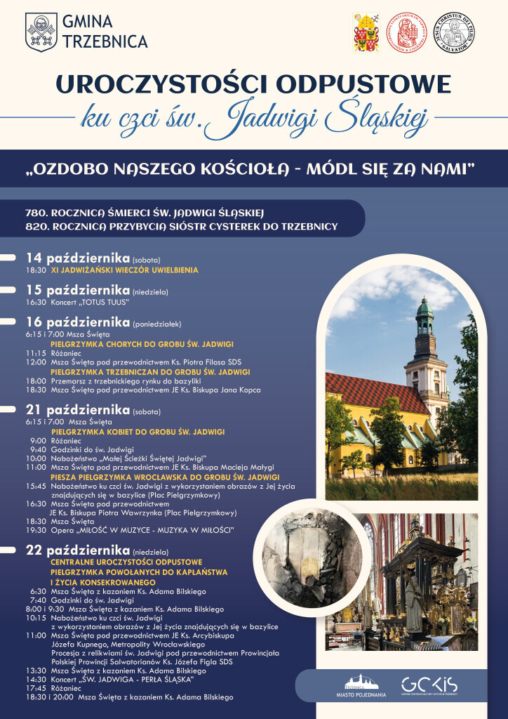 Uroczystości Jadwiżańskie w Trzebnicy odbędą się w dniach od 14 do 22 października. W sposób szczególny zapraszamy mieszkańców miasta do udziału w Pielgrzymce Trzebniczan do grobu Patronki Śląska i Trzebnicy, która odbędzie się 16 października. Szczegółowy plan uroczystości na plakatach.