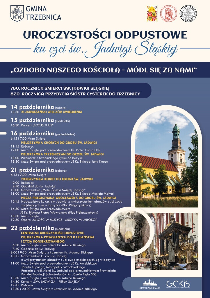 Uroczystości Jadwiżańskie w Trzebnicy odbędą się w dniach od 14 do 22 października. W sposób szczególny zapraszamy mieszkańców miasta do udziału w Pielgrzymce Trzebniczan do grobu Patronki Śląska i Trzebnicy, która odbędzie się 16 października. Szczegółowy plan uroczystości na plakatach.