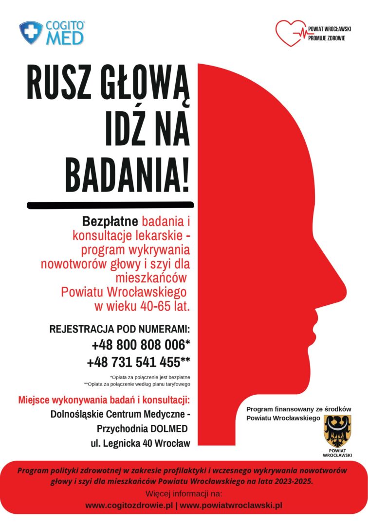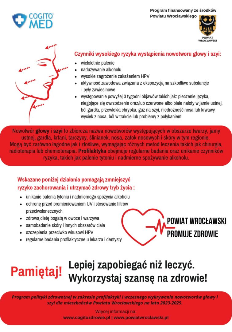 16 października 2023 r. rozpoczyna się realizacja bezpłatnego programu polityki zdrowotnej w zakresie profilaktyki chorób i wczesnego wykrywania nowotworów głowy i szyi dla mieszkańców Powiatu Wrocławskiego na lata 2023–2025.